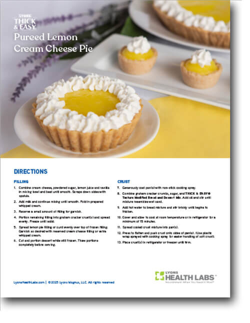Lemon Pie has been a staple in the southern U.S. for hundreds of years, popularized due to its tart bold flavor and bright appearance. Now, you can enjoy a lemon pie that will fit your pureed diet, while not lacking in taste! Our THICK & EASY® Lemon Cream Cheese pie is delicious, easy to make, and meets IDDSI Levels 4, 5 & 6.