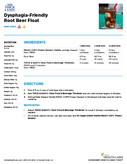 Enjoy a calorie- and calcium-rich dessert packed with flavor! Our Root Beer Float recipe uses Thick & Easy® Clear Food and Beverage Thickener and Magic Cup® Frozen Desserts with variations that meet IDDSI Level 2 (nectar) or 3 (honey) consistencies.